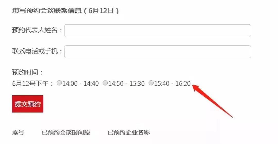 3.進入外資企業(yè)信息界面,填寫預(yù)約會談聯(lián)系信息,選擇6月12日預(yù)約會談的時間段,然后提交預(yù)約即可。