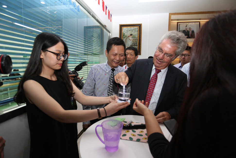 △來揭出席中奧企業(yè)合作洽談會的奧中友協(xié)主席、奧地利共和國前總統(tǒng)海因茨•菲舍爾考察大宇環(huán)保公司,體驗水凈化筆的凈水過程