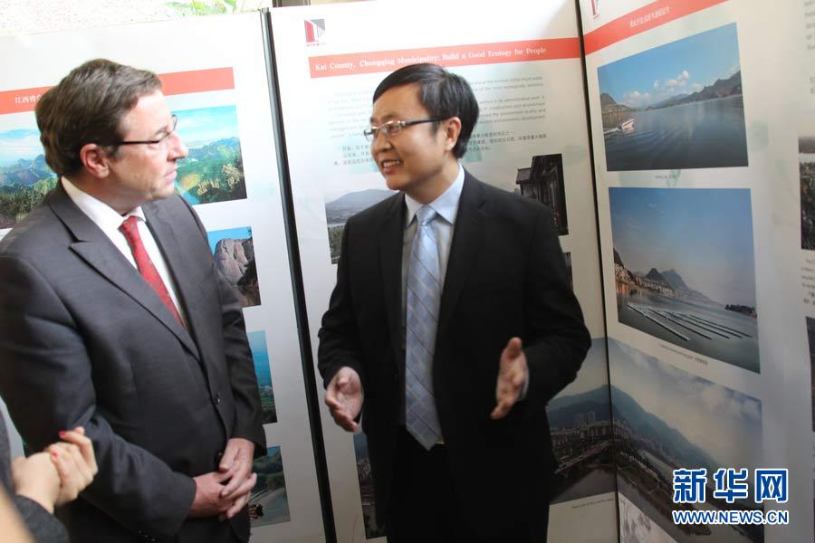 江西省贛州市會昌縣環(huán)境保護(hù)局局長李光標(biāo)(右)向聯(lián)合國副秘書長施泰納介紹基層環(huán)保事業(yè)發(fā)展現(xiàn)狀。汪勇基攝