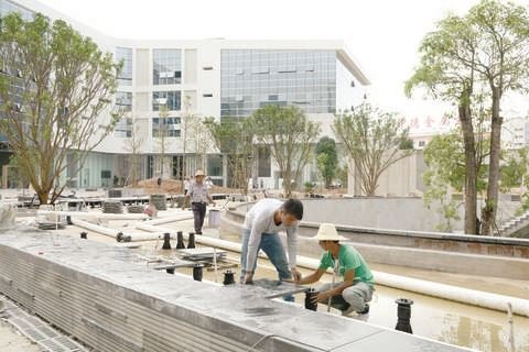 鋪貼石板、種植綠化、修筑景觀水池……國慶期間,中德金屬生態(tài)城四大中心工程中庭園林施工現(xiàn)場一派繁忙,工人有條不紊地推進各項施工。