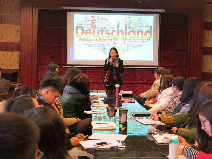 主講導師丁逢從德國國旗、地理位置、英語與德語的差異等方面為學員做了導入性的介紹,并提供了德語學習建議及應用APP。她還現(xiàn)場教授了德國人的日常問候語與自我介紹基本用語,讓學員得以更快地學以致用。