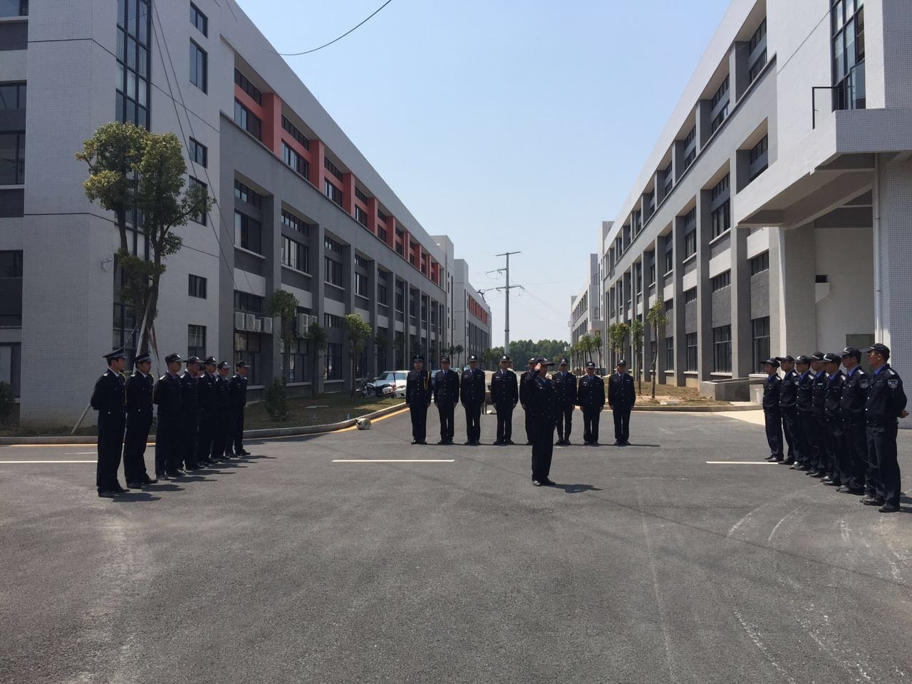 物業(yè)公司保安團隊在消防演習(xí)前進行出操訓(xùn)練